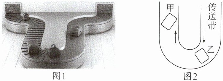 8. 图1是机场内正在匀速运行的传送带,图2是其俯视示意图。某时刻行李箱甲、乙运动到如图2所示的位置,下列说法正确的是(