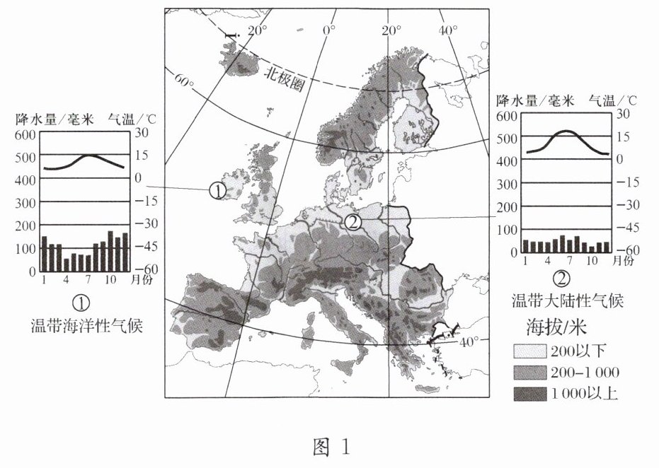 14. 读欧洲西部略图(图 1),完成下列各题。