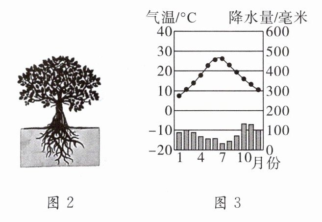 (3)地中海沿岸是油橄榄主要产区,油橄榄树根系发达。图 2 为油橄榄树示意图,图 3 为地中海气候图。下列关于油橄榄树适应环境的描述,正确的是(