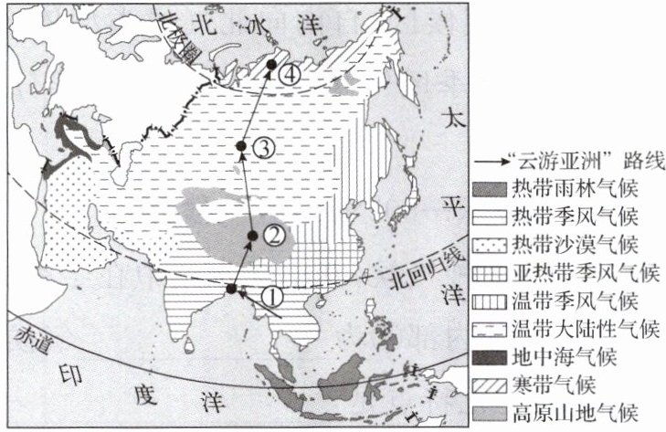 【地理实践力】地理兴趣小组的部分同学在假期利用网络模拟了“云游亚洲”的活动。下图为“云游亚洲”路线图。读图,完成5—6题。
