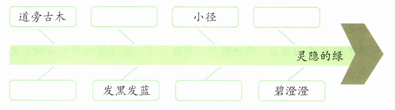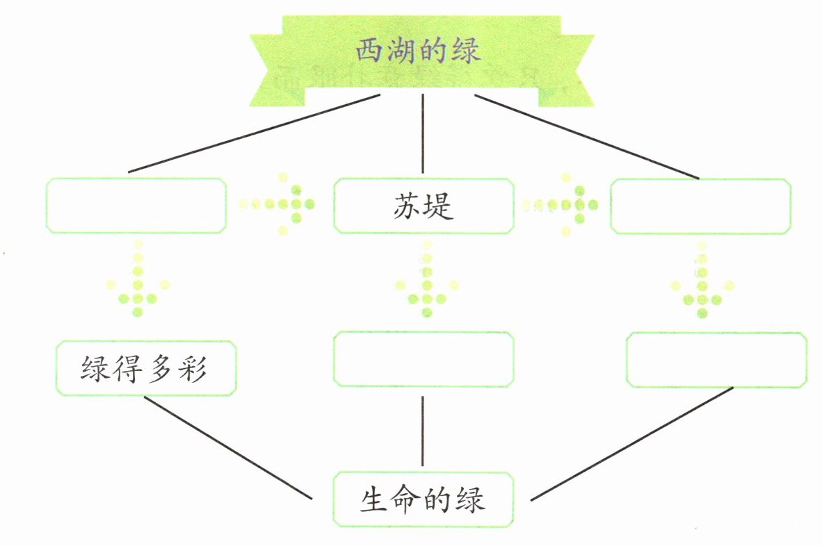 1 细读选文,想一想作者主要从哪几处写了西湖的绿,它们的绿分别有什么特点,完成思维导图。