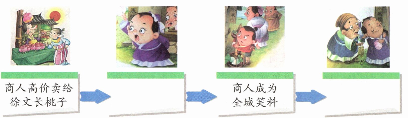 第二天、第三天,徐文长还是那样,一早就站在水果店门口了。来往的人不但没有一个来问桃子价钱的,反而都朝店里瞪起了眼睛。原来,100文钱买一个桃子的新闻,早已轰动全城,成为街谈巷议的笑料了。谁还会到这家水果店来买这样昂贵的桃子呢?