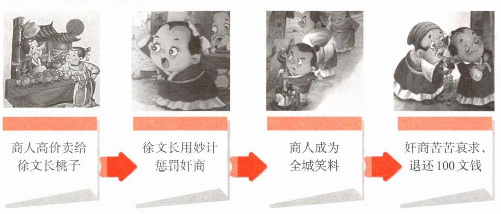 有一次,徐文长去水果店买桃子,老板瞧不起他,故意抬高价格,一个桃子要100文钱。徐文长将计就计,高价买下桃子,每天都搅乱老板的生意,让这个老板天天经营不下去。老板恨之入骨,又无可奈何,只好甘拜下风求和,把坑骗徐文长的100文钱还给了他。