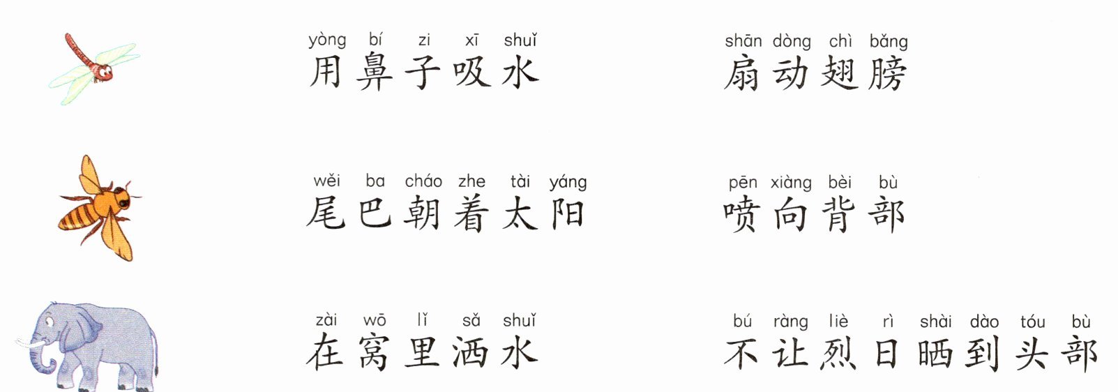 【解析】本题考查获取信息。在文中找到描写红蜻蜓、小蜜蜂、大象避暑方式的句子,如“红蜻蜓尾巴朝着太阳,不让烈日晒到头部,以防中暑”“小蜜蜂纷纷运来河水,洒在蜂窝里,扇动翅膀降温”“大象用鼻子吸足水,喷向自己的背部来降温”。最后根据找到的句子连线即可。