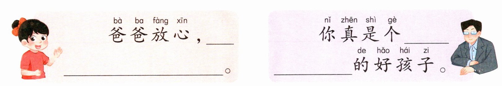 爸爸担心可可完不成这些事。请你补充对话。