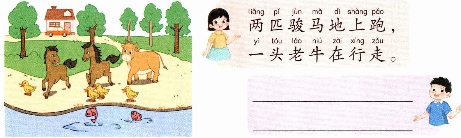 5. 示例1:两条小鱼水中游,四只小鸭岸边走。