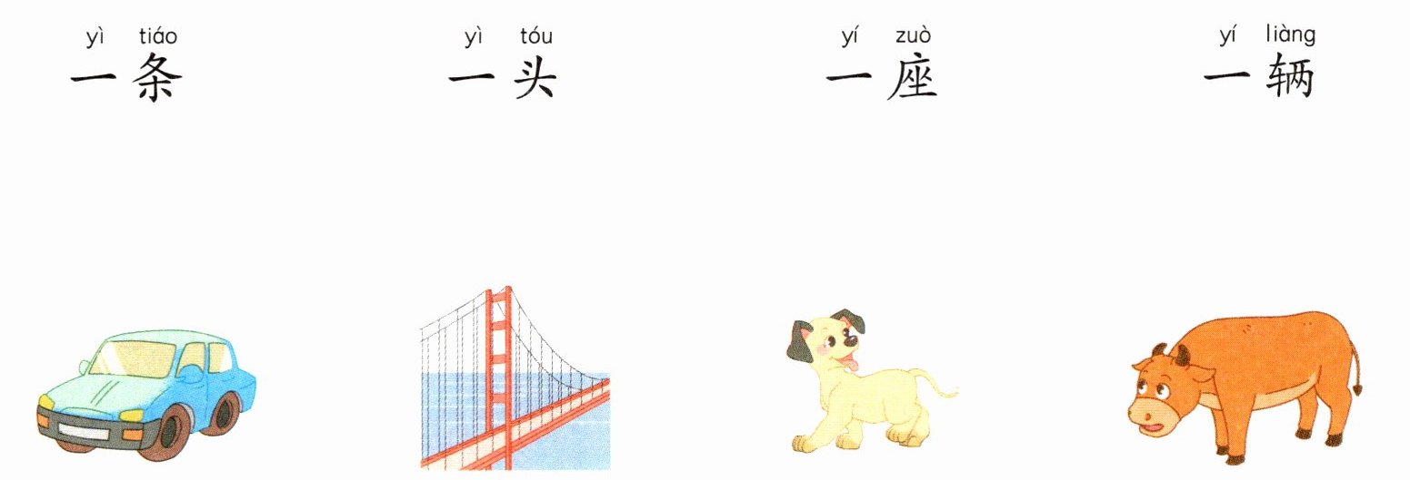 【解析】本题考查获取信息。阅读儿歌,由“一条小狗守门前”“一头老牛在耕田”“一座大桥跨两岸”“一辆汽车桥上跑”可知答案。