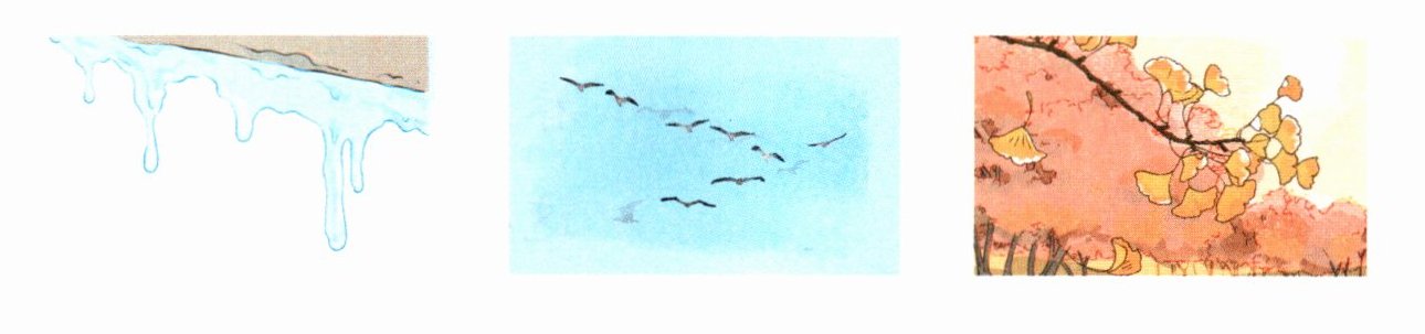 【解析】本题考查表达运用。题目中三幅图依次是冰雪融化、大雁南飞、银杏叶黄了,这些都是大自然的语言,模仿诗歌的第二、三、四、五小节,写成三排的小诗,诗中写清什么事物怎么样,是大自然在诉说些什么,语句通顺即可。
