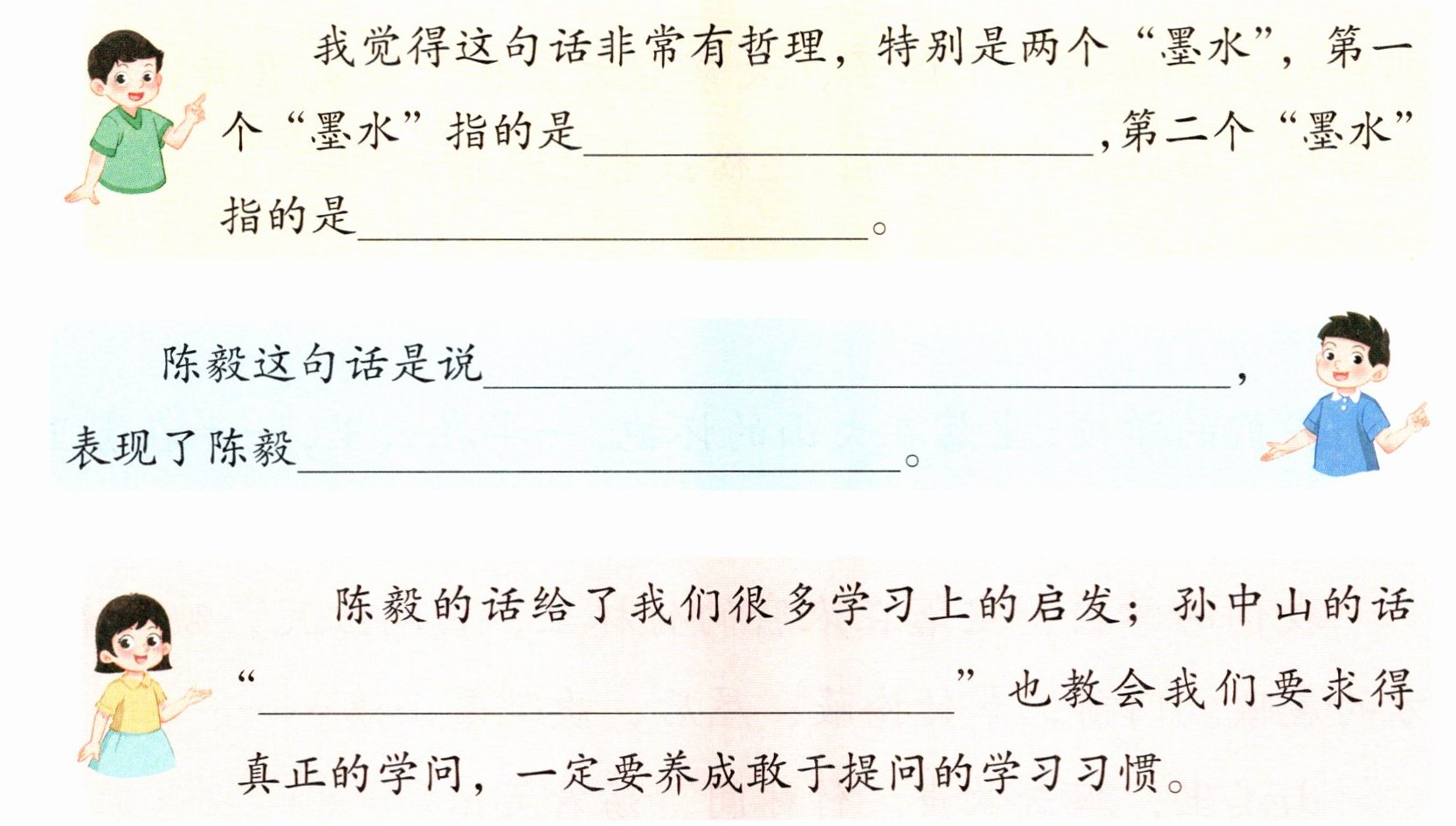 【解析】本题考查对句子的理解。我们可以通过查词典的方法知道前两个空的答案;陈毅看书十分投入,吃了墨水也满不在乎,说明他认为只要能学到知识,不小心吃了墨汁也没关系,体现了他对知识的渴求;最后一空可以联系课文内容,从孙中山说过的话中找出答案。