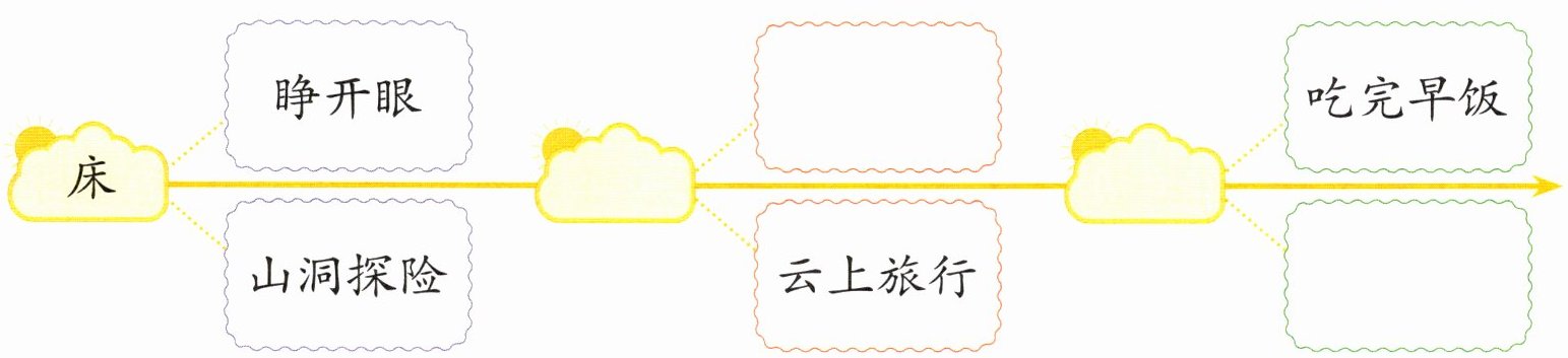 我的家很大很大1.(从左到右)洗手间 刷牙 客厅 爬山下山【解析】本题考查内容理解与概括。结合“我噘着嘴去刷牙,可是很快我又高兴起来”“我坐上了一朵云,云是洗手间天花板上的一块水渍变的。我在云朵上刷牙”“我不情愿地吃完早饭,可是很快我又高兴起来”“我再干点什么?我家的客厅很大很大,可以做很多好玩儿的事。客厅里的柜子、椅子、茶几都能成为山。山可以移动,我让山长在哪里它就长在哪里。我爬得飞快,比任何一个玩具小人儿都快。我总是第一个到达山顶,把小红旗插在山顶上。我又赢了!下了山,我跟敌人打仗”可知答案。2.A【解析】本题考查字词理解。结合“每天早晨一睁开眼,我就钻进山洞探险”“可是我的手指还没走出洞口,山洞就被妈妈掀开了”可知,“山洞”是可以“掀开”的,结合选项可知“山洞”指的是被窝。故选A。答题模板 联系上下文,理解词语的意思1 读词语,判断词语的字面意思。2 找到词语在文中的位置,联系上下文推测词语在文中的意思。3 答题时,先写词语的本意,再写词语在文中的意思。3.我家的客厅很大很大,可以做很多好玩儿的事。示例:下了山,我跟敌人打仗。我修建城堡,筑工事,挖壕沟。作者把客厅想象成战场,把自己想象成一名战士,还在“战场”上“修建城堡,筑工事,挖壕沟”,想象奇特,内容有趣,非常吸引人。【解析】本题考查找关键词句。第⑤自然段的第一句话问“我”要干什么,第二句话写了“我”家的客厅大到可以做很多好玩儿的事,后面的句子则具体写了“我”在客厅做的好玩儿的事,如爬山插旗、下山打仗。因此可以知道第⑤自然段是围绕“我家的客厅很大很大,可以做很多好玩儿的事”写的。阅读第⑤自然段,然后选出认为想象奇特的一处并进行赏析即可,答案不唯一。4.C【解析】本题考查对文章内容的推测。通读文章可知,“我”做的很多好玩儿的事都是现实生活中不可能实现的,如观察山洞里的怪兽、在云朵上刷牙、骑着宠物狗指挥千军万马等。从现实生活中不可能实现的角度出发,可以发现“和玩具小人儿坐上皮鞋做的船,开进储物室,来个宝藏探险”是“我”最有可能做的事情。故选C。5.妈妈认为家很小,指的是家中面积小。而“我”想象奇特,把家中的家具想象成各种有意思的事物,“我”在这些想象出的事物里做着各种有意思的事情,这让“我”感到非常快乐。所以“我”认为家很大很大。6.示例:爸爸妈妈不在家时,我曾披着床单假扮白娘子,还幻想自己身受重伤,然后运功疗伤。