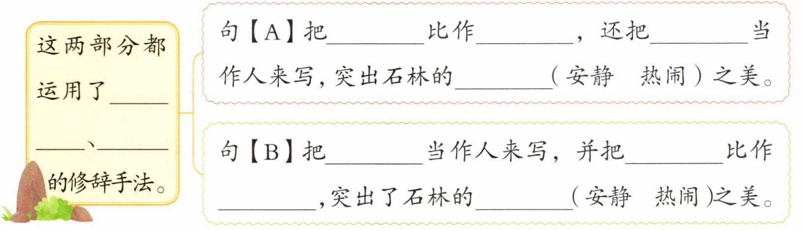 【解析】本题考查修辞手法及对句子的理解。句【A】中把沉默的石头们比喻成石雕的哲学家,把月光洒在石头上说成石头扬起的脸庞光芒四射,运用比喻和拟人的修辞手法写出了石林的安静;句【B】中“痒酥酥的,想笑”赋予石头人的情态,并把因蜈蚣遮挡而分成一块一块形状的月光比喻成花瓣,体现了动物出来后石林的热闹。