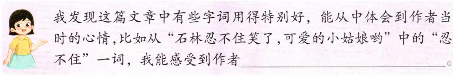 【解析】本题考查对词语的赏析。阅读句子可知,“忍不住笑了”把石头拟人化了,形象地写出了石林的调皮可爱,从中可以感受到作者对石林的喜爱之情。