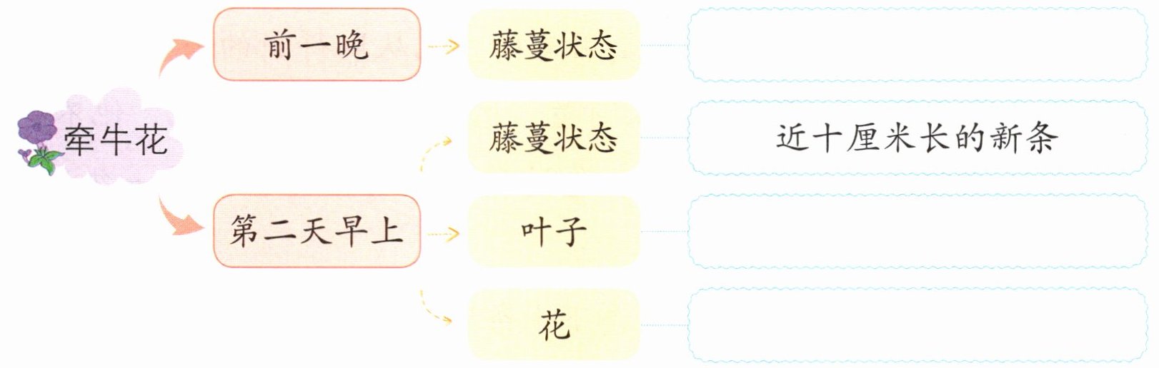 1. 获取信息 第⑥自然段描写了牵牛花攀爬生长的过程,请结合第⑥自然段完成下面的思维导图。 阅读要素2