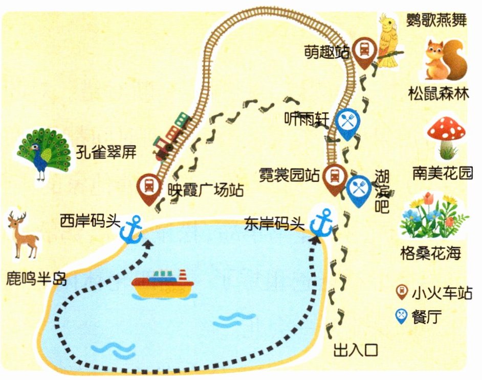 3. 分析综合 小花想去映霞广场站看孔雀,妈妈想去霓裳园站看格桑花,弟弟想去萌趣站看松鼠,爸爸想坐小船游览美景,请你为他们设计一条合理的游玩路线,满足所有人的要求(尽量少走回头路)。