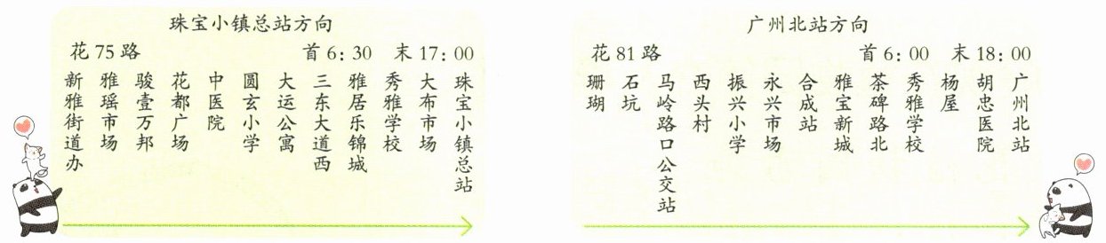 【解析】本题考查获取信息。从材料三可以看出,小花一家坐公交车从“花都广场”出发,可先选择坐花 75 路公交车,经过“中医院、圆玄小学、大运公寓、三东大道西、雅居乐锦城”5 站,到秀雅学校站下车,到路对面,换乘花 81 路公交车,坐到马岭路口公交站下车。
