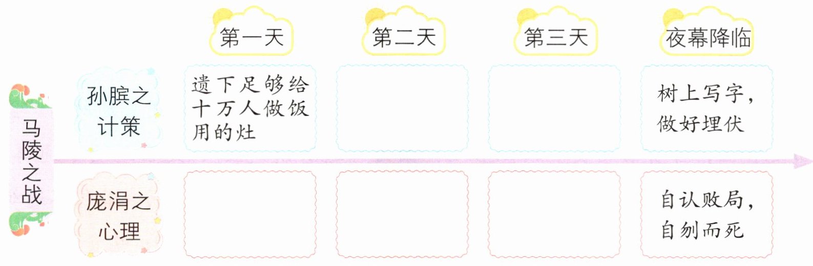 1. 整体感知 可可想在班级“历史故事传讲会”上重点介绍孙膑在马陵之战中所使用的计谋以及庞涓的心理变化,请帮助她完善思维导图。