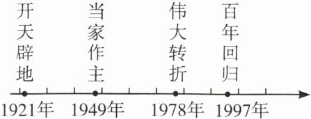 (1)“开天辟地”:中共一大召开;(或中国共产党成立)“当家作主”:中华人民共和国成立;“伟大转折”:中共十一届三中全会召开;“百年回归”:1997 年 7 月 1 日香港回归祖国。