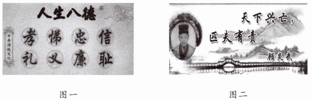 图一。推荐理由:孝悌忠信、礼义廉耻的荣辱观念。判断一切是非、善恶、荣辱,都需要明确的标准。“由义为荣,背义为辱。”中华民族一贯以遵守道德为荣,以违背道德为耻。这一荣辱观念渗透在生活的方方面面,成为中国人日用而不觉的道德标准。或图二。推荐理由:天下兴亡、匹夫有责的担当意识。中华民族强调“明伦”“尽责”,要求每个人明确认识到自己的人伦职责,不仅要担负起对家庭、社会、国家的责任,而且要兼济天下,为天下人谋幸福。这种担当意识体现了中华民族的博大胸怀和崇高境界,为中华民族发展壮大提供了重要支撑。