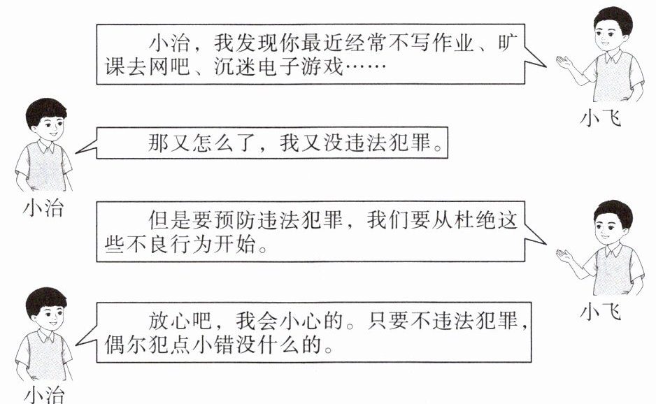 ①小治的观点是错误的。②他的不良行为没有违法犯罪,但青少年预防违法犯罪应从明辨是非、杜绝不良行为做起。③很多犯罪都不是一朝一夕铸成的,而是有一条从不良行为到违法行为、再到犯罪的变化轨迹。④预防未成年人犯罪法对未成年人不良行为的干预、严重不良行为的矫治作了明确规定,给我们划出了明确的是非界限。⑤小治不写作业、旷课去网吧、沉迷电子游戏的行为均属于不良行为,如果不重视,忽视小错,任其发展,就有可能走上违法犯罪的道路。(结合要点,言之有理即可)