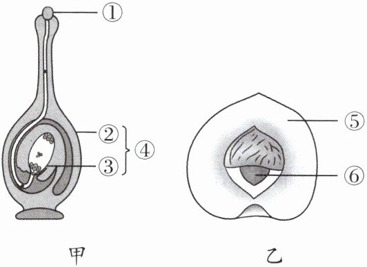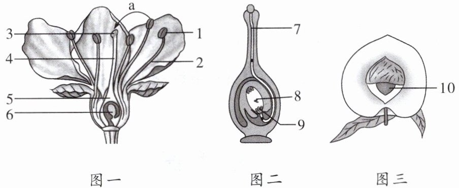 10. “人间四月芳菲尽,山寺桃花始盛开。”春天是桃花盛开的季节,点点飞红,在诗人的眼中,桃花惊艳了整个春天。下图是桃花的结构、受精过程及果实结构示意图,请据图回答下列问题。