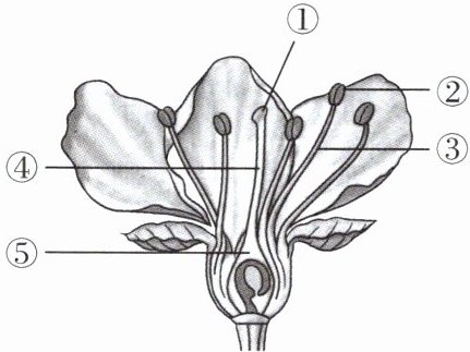 B 花的主要结构是雄蕊和雌蕊。雄蕊由②花药和③花丝组成,雌蕊由①柱头、④花柱和⑤子房组成,A 项错误。②花药中的花粉落到①柱头上的过程叫作传粉,而不是受精,C 项错误。完成受精后,②花药和③花丝会凋落,①柱头和④花柱也会凋落,只有⑤子房继续发育成果实。