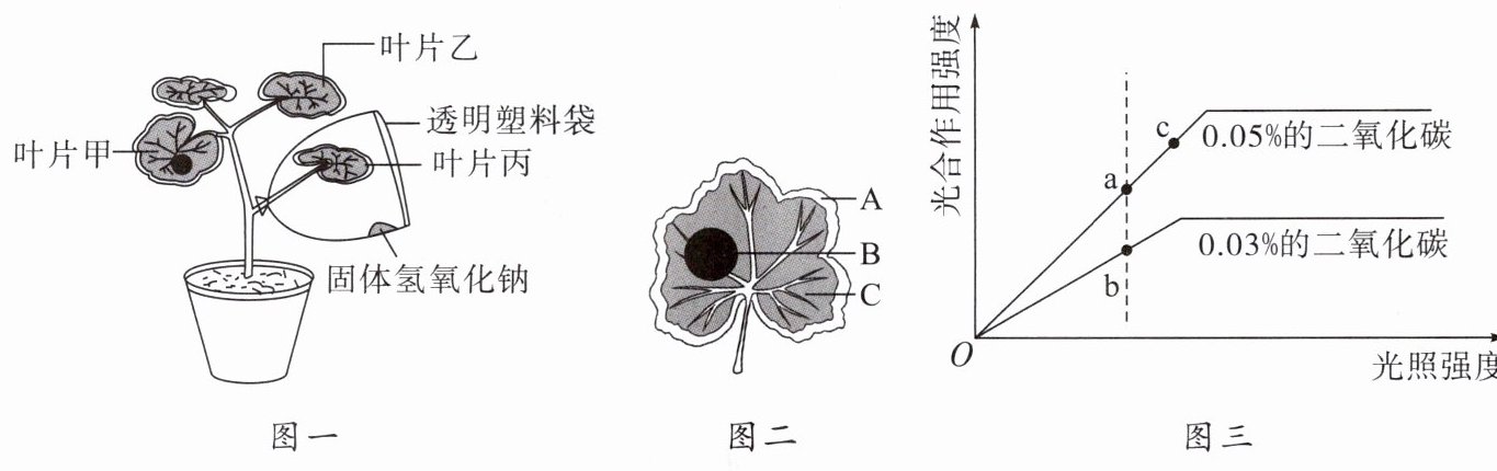 11. 科学探究是学习和研究生物学的常用方法。某中学生物兴趣小组的同学将放到黑暗处一昼夜的银边天竺葵进行如下图一所示的处理(固体氢氧化钠可以吸收空气中的二氧化碳),图二为叶片甲的放大图。图三是一段时间内二氧化碳浓度和光照强度对大棚内蔬菜光合作用强度的影响的曲线图。请分析并回答下列问题。
