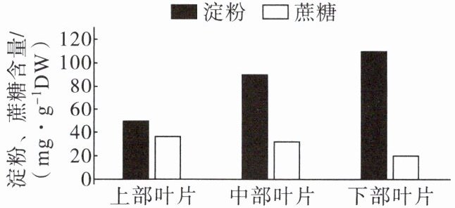 (4) 植物光合作用合成的糖类有淀粉、蔗糖等,淀粉用于储能,蔗糖是植物体内糖的主要运输形式。同学们查阅了甜椒上、中、下部叶片内糖类成分及含量的相关资料,部分数据如右图所示。由图可知,甜椒上部和中部叶片内蔗糖含量相对较高,请你推测这对于甜椒生长发育的意义是