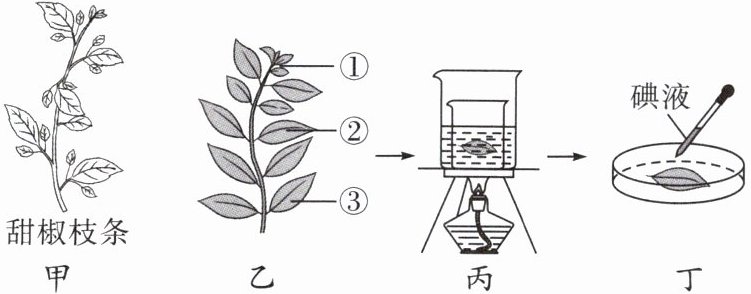 。(2) 观察到的实验现象是①号叶片颜色为浅蓝色,②号叶片颜色为深蓝色,③号叶片蓝色最深。由此可知,从淀粉含量的情况来看,甜椒植株上部的叶片中