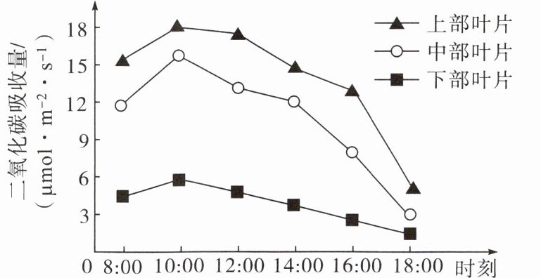 。(3) 同学们查阅文献资料时,看到下图所示的研究结果。科研人员以单位时间、单位面积内二氧化碳吸收量来表示光合速率。研究发现各部位的叶片在