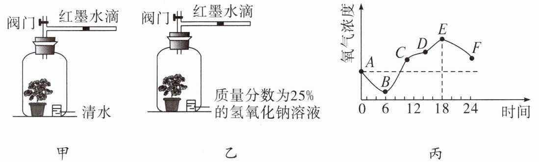 (2)图丙是甲装置一天中氧气浓度的变化曲线,其中光合作用强度等于呼吸作用强度的点是