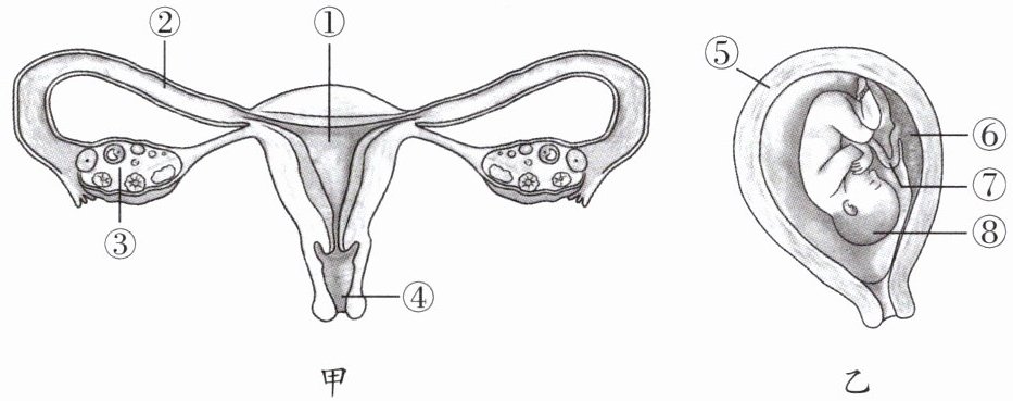 12. “谁言寸草心,报得三春晖。”母亲十月怀胎,历经艰辛抚育我们成长,纵有千言万语也无法表达我们的感恩之情。图甲是女性生殖系统示意图,图乙是胎儿、脐带和胎盘关系的示意图。请回答下列问题。