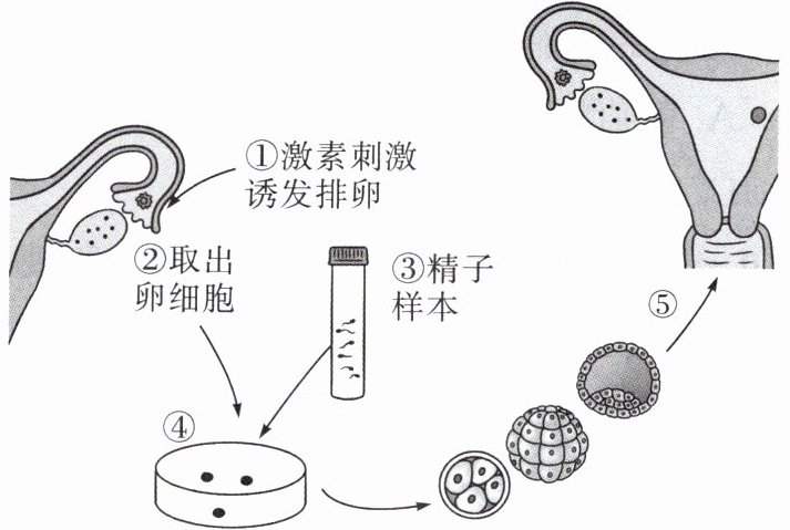 (3)精子和卵细胞结合形成受精卵,经过细胞分裂和分化过程后形成早期胚胎,步骤⑤表示早期胚胎植入子宫。
