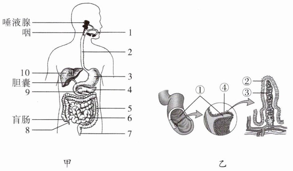10. 图甲是消化系统示意图,图乙是小肠壁结构示意图。请回答下列问题。