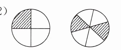 (2) 第一个图形把一个圆平均分成$4$份,阴影部分占$1$份,所以表示的分数是$\frac{1}{4}$;