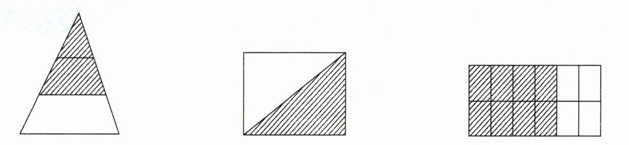 第一个图形:将三角形的底边平均分成3份,阴影部分占其中的2份,但是根据图形面积的计算,阴影部分并不是$\frac{2}{3}$,而是$\frac{1}{2}$(因为阴影部分是由多个小三角形组成,其面积总和等于大三角形面积的一半),所以“$\frac{2}{3}$”是错误的,画“×”。