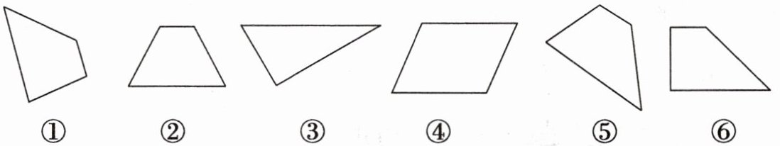 答案:①③④是四边形;③④两组对边分别平行,是平行四边形;②⑥只有一组对边平行,是梯形。