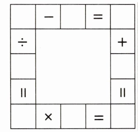 小小格子16个,一格算术符号一格数。请你填上1至8个数,使得横竖等式都成立。