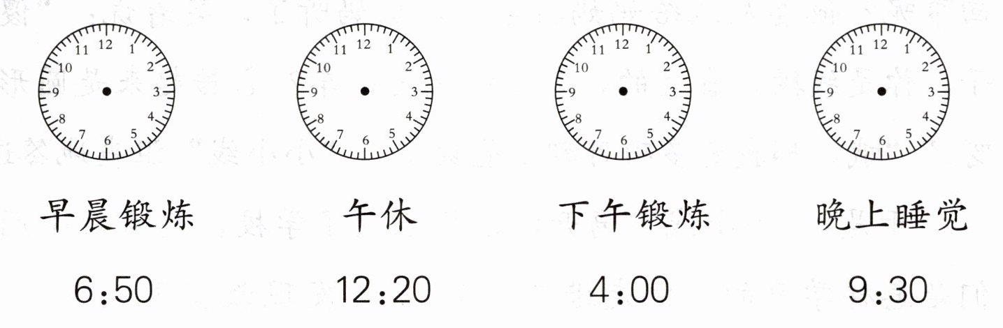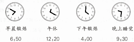 三、下面是张爷爷每天的活动安排,请你在钟面上画出相应的时间。