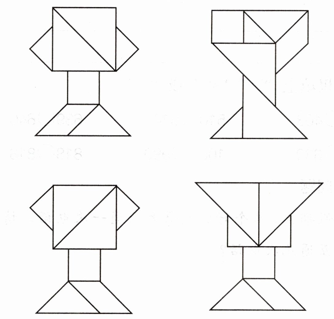 【答案】:第一行左图像高脚杯;第一行右图像酒杯;第二行左图像有耳杯;第二行右图像碗(答案不唯一,合理即可)。还能拼出盘子等餐具造型(具体造型根据实际拼搭情况而定)。