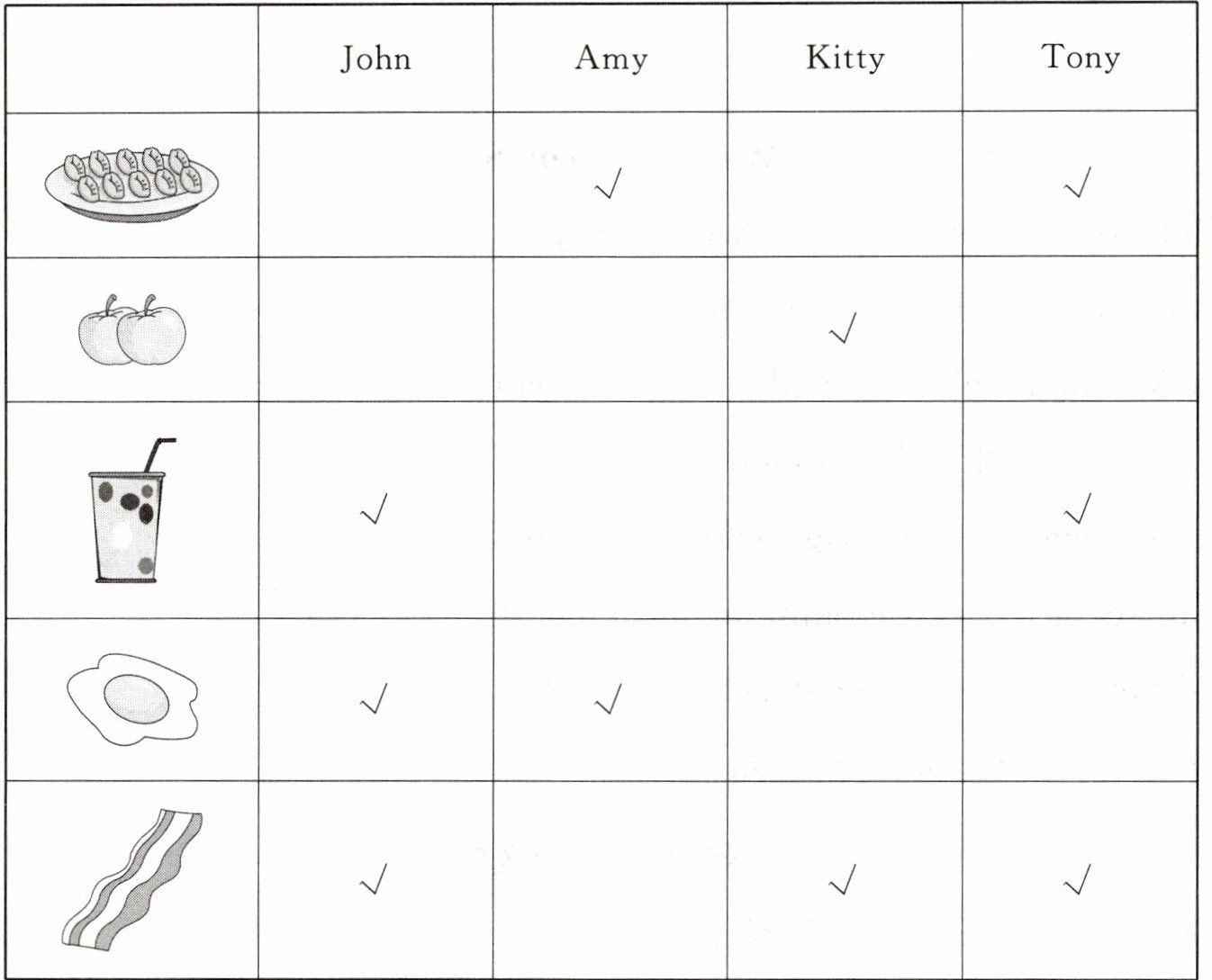 John: I'd love some bacon, an egg and juice for breakfast. 1. ______