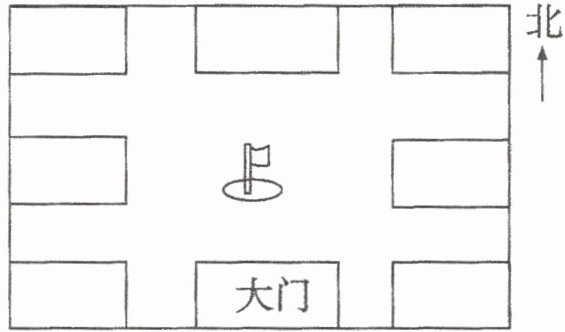 “走进大门,旗杆在大门的北面。旗杆的北面是①教学楼,东面是②体育馆,西面是③艺术楼,④多功能教室位于旗杆的东北方向,旗杆的东南方向是⑤停车场,⑥生态园位于旗杆的西南方向,⑦食堂的南面是艺术楼……”根据这段描述,把各建筑物的序号写在相应的位置上。