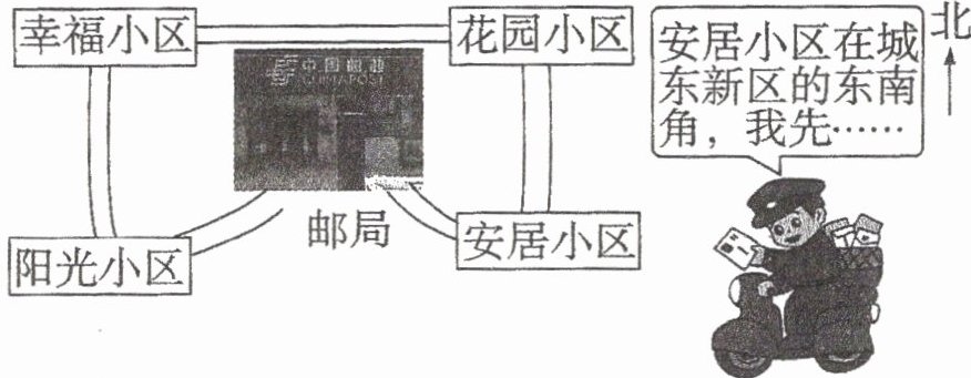 刘叔叔送报的路线是:中国邮政$\xrightarrow{东南}$安居小区$\xrightarrow{