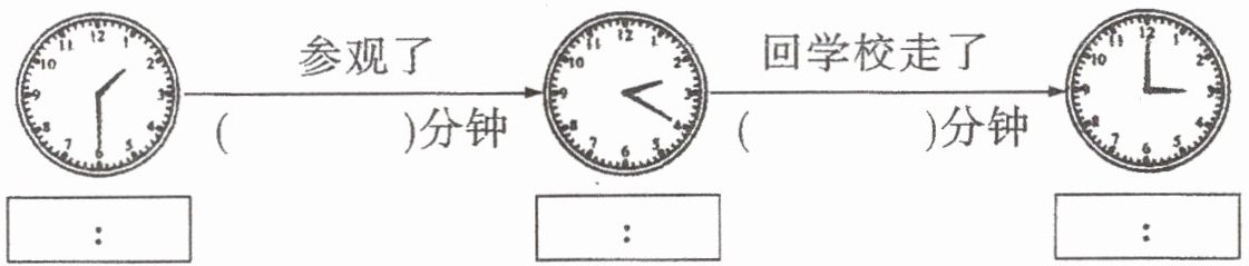 4. 笑笑下午去参观植物园,请用24时计时法表示钟面上的时间,并填出经过的时间。
