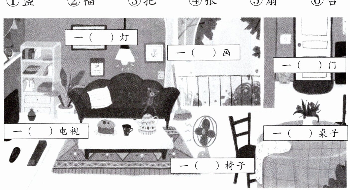 ①盏 ②幅 ③把 ④张 ⑤扇 ⑥台