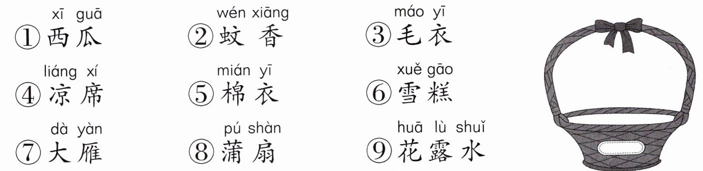 ⑦大雁(dà yàn) ⑧蒲扇(pú shàn) ⑨花露水(huā lù shuǐ)