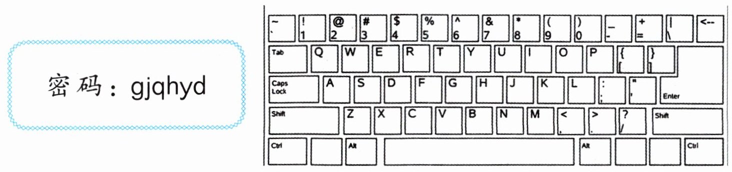 四、下面是丽丽同学的电脑密码,请你帮她在键盘上找到