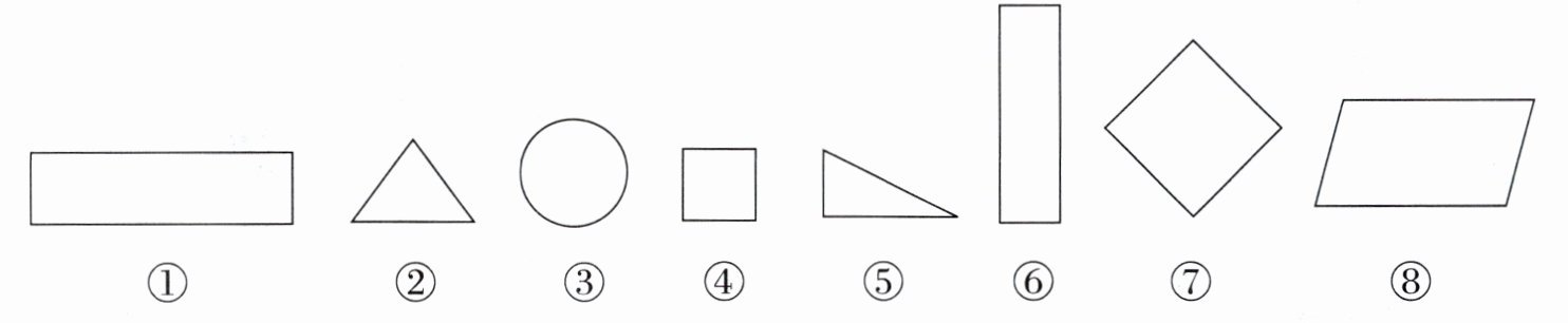 2.正方形:④ ⑦ 平行四边形:⑧ 长方形:①⑥ 三角形:② ⑤ 圆:③