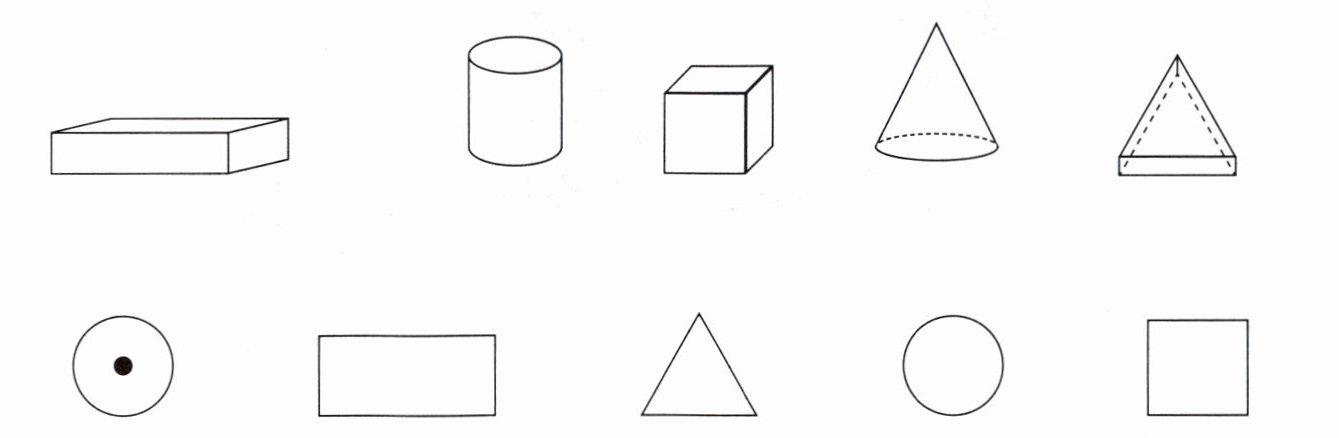 答案:长方体连长方形;圆柱连圆形;正方体连正方形;圆锥连有黑点的圆形;三棱锥连三角形。