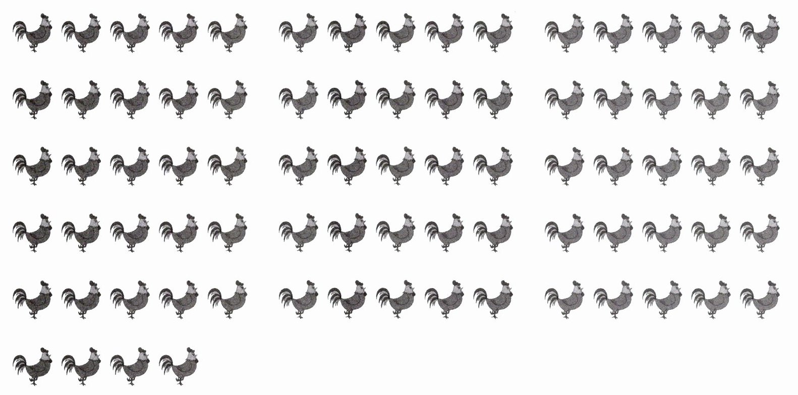 2. 五只五只地数,数了( )只,再数不够五只的,一共有( )只鸡。