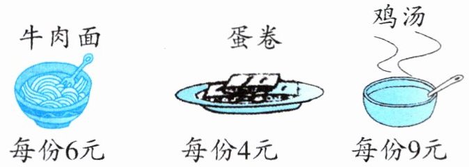 牛肉面:$ 36 ÷ 6 = 6 $(份) 或蛋卷:$ 36 ÷ 4 = 9 $(份) 或鸡汤:$ 36 ÷ 9 = 4 $(份)